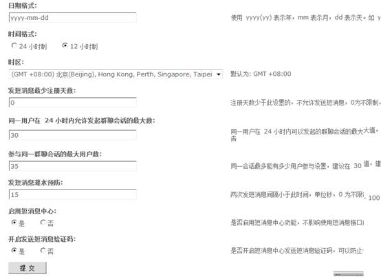 UCenter的基本设置,主要是针对注册用户发短消息的设置,目的是防止机器人利用短消息功能狂发广告。此处日期、时间格式与时区的设置不影响应用中的相应项。