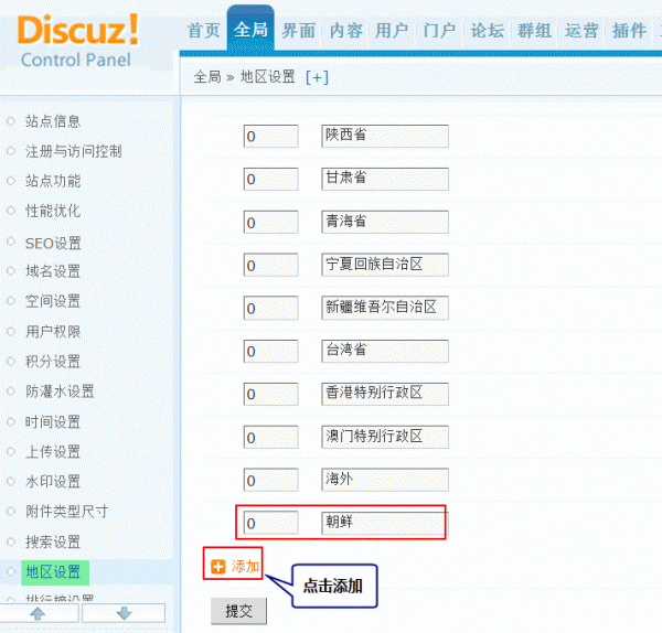 直接在地区设置下方输入要添加的地区名,点击添加,然后点提交即可,如下图所示: