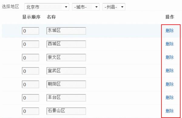 我们可以在后台对地区进行设置,增加地区、删除以及修改。