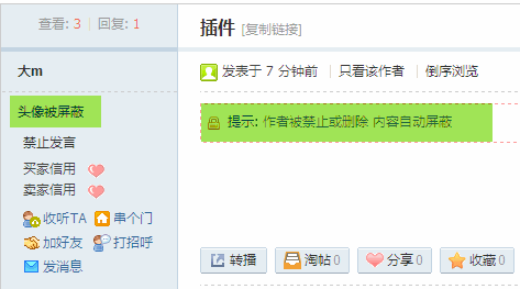 选择相应项目将隐藏被删除或被禁止的用户的相关资料,在相关资料处显示被屏蔽的字样。分别为可隐藏帖子内容、用户头像和用户签名,比如我们选择隐藏帖子内容和用户头像,在前台当会员被禁止后显示效果如下: