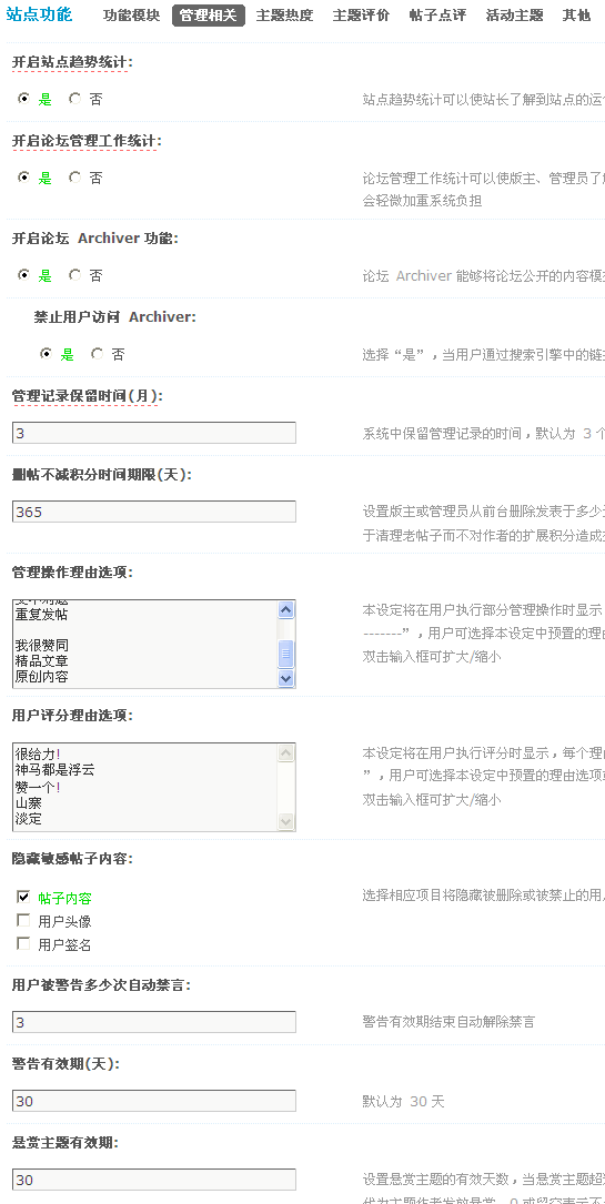 可以对站点趋势统计、论坛管理工作统计、论坛 Archiver 功能、管理记录保留时间、删帖不减积分时间期限、管理操作及用户评分理由、隐藏敏感帖子内容、自动禁言和警告有效期以及悬赏主题有效期进行操作。如下图所示: