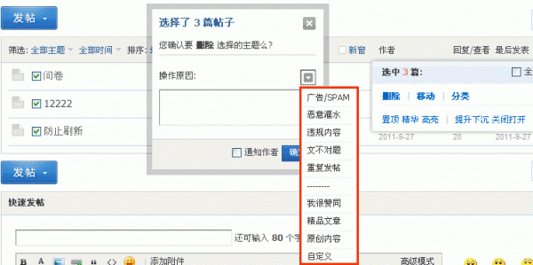 本设定将在用户执行部分管理操作如删除帖子时显示,每个理由一行,如果空行则显示一行分隔符“--------”,用户可选择本设定中预置的理由选项或自行输入,在前台进行管理操作时,效果如下: