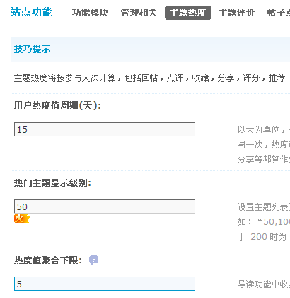 主题热度中有三项基本的设置:用户热度值周期、热门主题显示级别和热度值聚合下限。