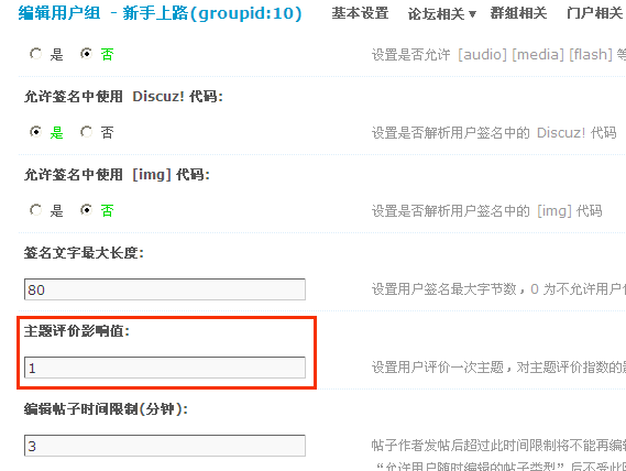 需要结合用户组的设置进行主题点评,不同用户组会员的主题评价影响值不同。