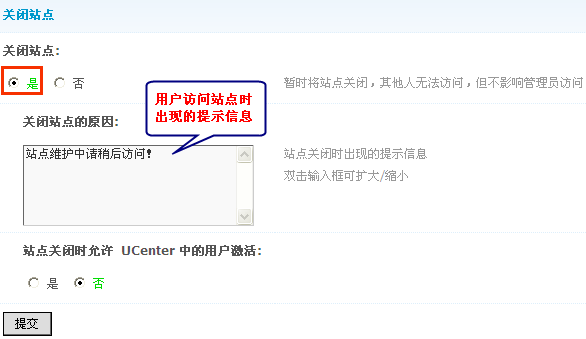 站点关闭时允许 UCenter 中的用户激活:用在当该站点关闭后,从其它应用注册的会员,访问站点是否允许激活的情况,如果选择“否”从其他应用注册的会员不允许激活,如果选择“是”则允许激活。