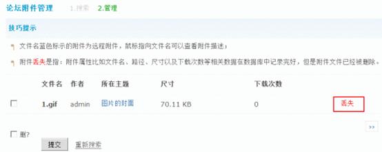 论坛自带了对附件的管理功能。通过这个管理功能,管理员可以根据条件搜索附件,对搜索到的附件进行删除、下载、打开附件所在主题,还可以对附件的数据表进行整理,将服务器上已经不存在的附件的信息在数据表中删除,减小附件表的数据量,进而增加附件检索的速度。