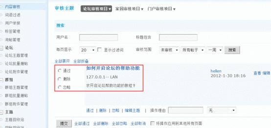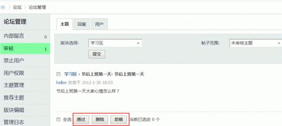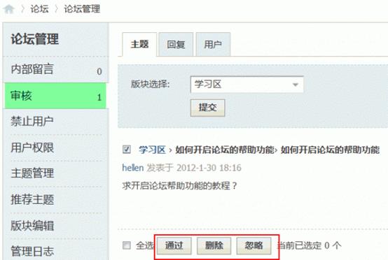 2、批量操作:可以点击下面的全部通过,全部删除,全部忽略,全部取消进行新主题的批量操作。也可以点击每个需要审核的主题左边的单选框进行单个审核。