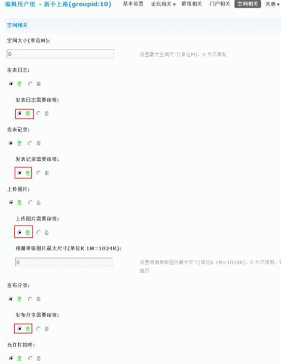 管理员进入站点【后台】=>【用户】=>【用户组】=> 点击指定用户组后的“编辑”,也可以选择多个用户组点击“批量编辑”后进入用户组权限编辑界面,然后点击【空间相关】,设置发表日志/图片/记录/分享需要审核,如下图所示: