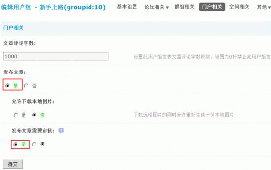 管理员进入站点【后台】=>【用户】=>【用户组】=> 点击指定用户组后的“编辑”,也可以选择多个用户组点击“批量编辑”后进入用户组权限编辑界面,然后点击【门户相关】,开启用户发表文章的权限,然后设置文章是否需要审核。