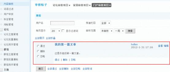 内容审核功能在站点内起到防止灌水,净化站点内容的作用,内容审核包括论坛审核项目、家园审核项目以及门户审核项目。可谓是全方面的涵盖了所有和内容有关的审核,可以大大减少垃圾内容以及广告内容的产生几率。管理者维护站点更加方便、快捷。