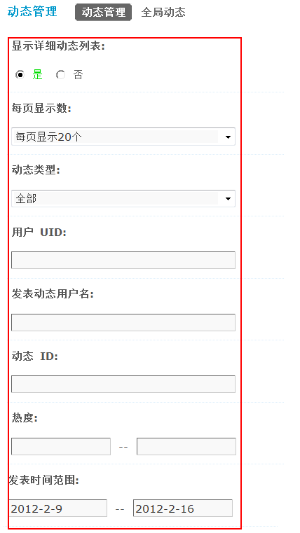 5、发表动态用户名:按发表动态的用户名进行搜索,多用户名中间请用半角逗号 "," 分割。
