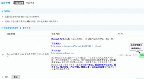 点击最右侧的“编辑”链接即可对搜索到的全局动态进行修改。