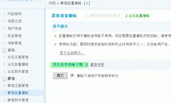 1、群组批量删帖仅用于删除违规帖子使用,如您需要批量删除历史旧帖,请使用群组批量主题管理功能。
