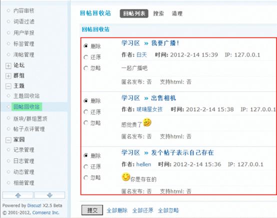 回帖回收站中,可以根据不同的版块,原帖作者,内容关键字,帖子发表时间范围等条件进行搜索,并对搜索出来的帖子进行处理。