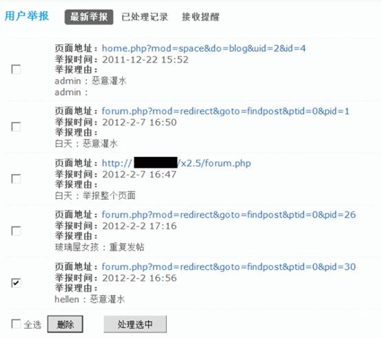 这里列出了用户在站点中最新的举报,包括页面地址、举报理由、举报人、举报时间等,可以根据举报真实情况,给举报者加减积分。