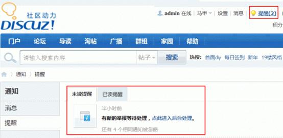 当有会员举报信息,“admin” 这个管理员和超级版主“玻璃屋女孩”访问站点的时候,页头会有新提醒。