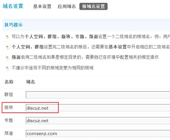 绑定域名:需要到【全局】=>【域名设置】=>【根域名设置】中设置版块的根域名后这里的设置才会有效。