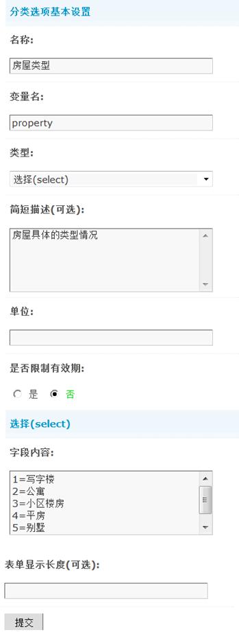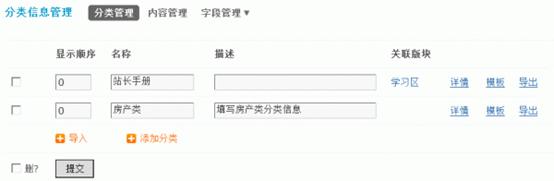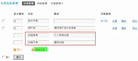 填写要添加分类的显示顺序、名称、描述,然后提交即可,这里我们添加两个分类,如出租楼房和出租平房。