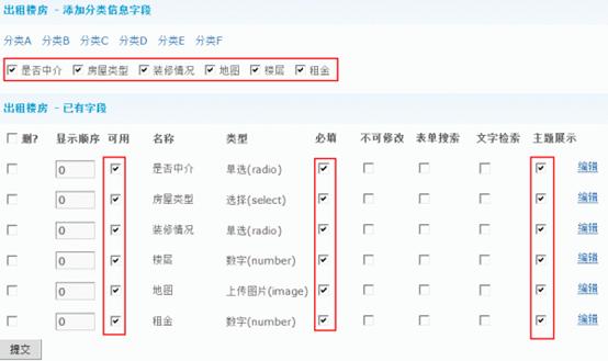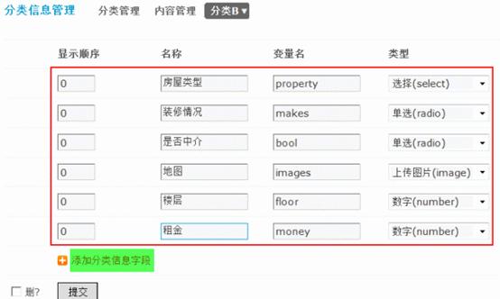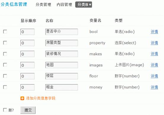 操作路径:【后台】=>【论坛】=>【分类信息】=>【分类信息管理】=>【字段管理】=>选择某一个分类,在这里添加分类信息使用的变量,名称如房屋类型、装修情况、是否中介等。