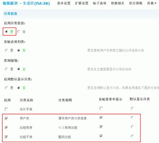 操作路径:【后台】=>【论坛】=>【版块管理】=> 编辑要关联分类信息的版块 => 其它 => 分类信息,启用分类信息