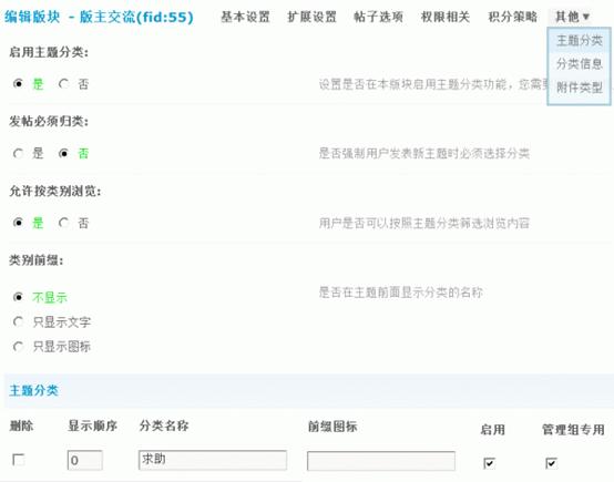 其他设置里包括对版块的主题分类、分类信息以及允许上传的附件类型进行设置。