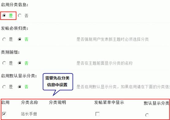 启用分类信息:选择“是”,再设置相应的分类信息选项, 即可在本版块开启该功能;