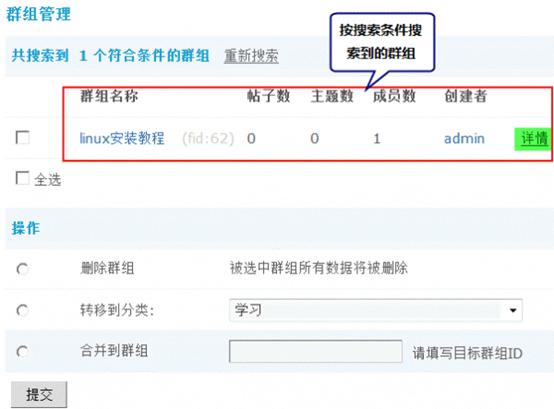 除了创建者可以在前台管理自己的群组外,管理员也可以在后台对所有已有的群组进行管理操作,可以对群组的各项参数进行设置。