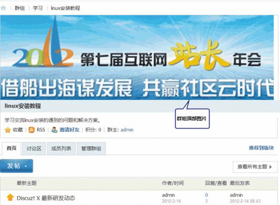 顶部图片:该群组的顶部图片,可以使群组的表现力更加丰富,用户可以选择能够体验群组特性的个性化图片装饰群组页面。在前台的显示效果为: