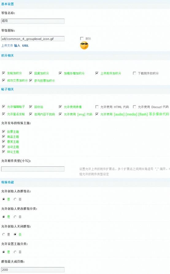 包括等级名称、等级图标、积分相关的设置、帖子相关的权限、允许发布的特殊主题、允许的附件类型以及特殊功能和群组最大成员数的设置。