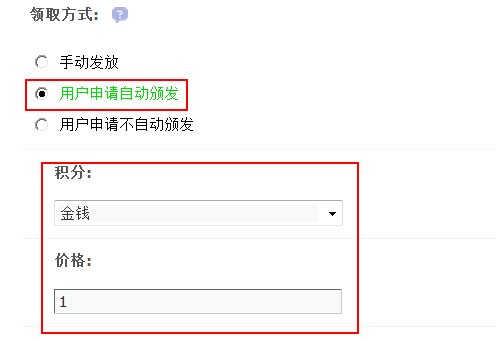 用户申请自动颁发:选择此项,可以设置用户用某一积分项购买勋章。我们设置如下: