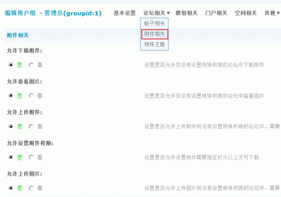 3)允许上传附件:设置是否允许上传附件到没有设置特殊权限的论坛中。需要 PHP 设置允许才有效,请参考管理中心首页