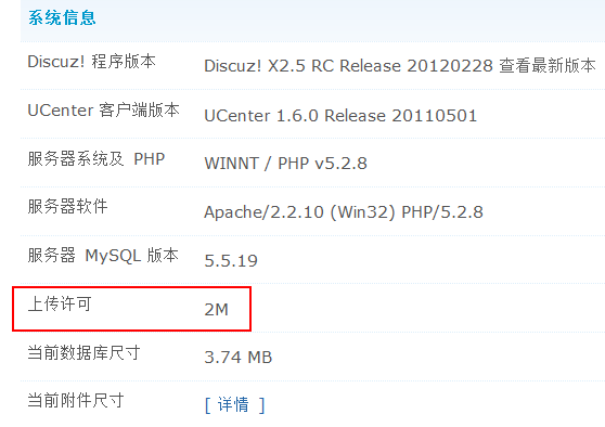 6)论坛最大附件尺寸(单位K 1M=1024K):设置用户上传的每个附件的最大尺寸。需要 PHP 设置允许才有效,请参考管理中心首页同上。