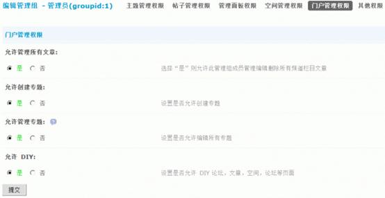 1)允许管理所有文章:是否允许管理门户文章。选择“是”则允许此管理组成员管理编辑删除所有频道栏目文章,