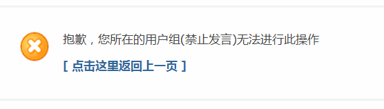 禁止类型:选择正常状态可以恢复该用户的普通身份,禁止发言后该用户可以登录站点但不能在站点内浏览帖子、发表言论、如发表帖子等,浏览帖子或者发帖子时提示如下: