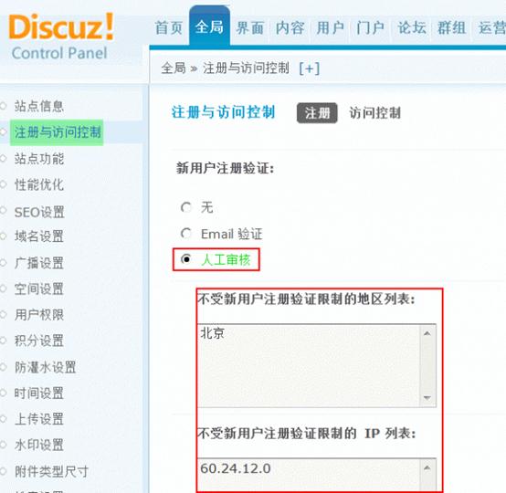 管理员可以对新注册的用户进行审核,以确定是否允许该用户注册。一般刚起步的小型站点,为了防止注册机、只来发广告的用户或者公司内部论坛会用到该功能。
