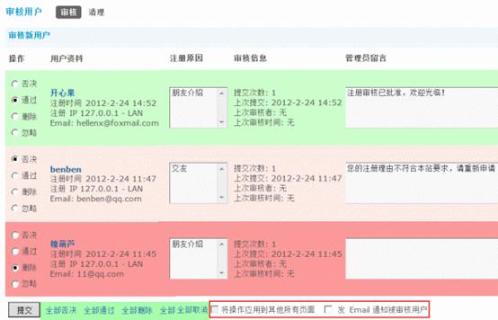 可进行单独审核或批量审核;管理员可对审核的用户留言;可选择是否发送 Email 通知被审核用户。