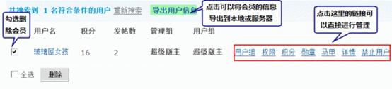1、管理用户(编辑会员的资料、用户组、权限、积分,授予会员勋章,查找马甲、禁止用户以及删除会员等);