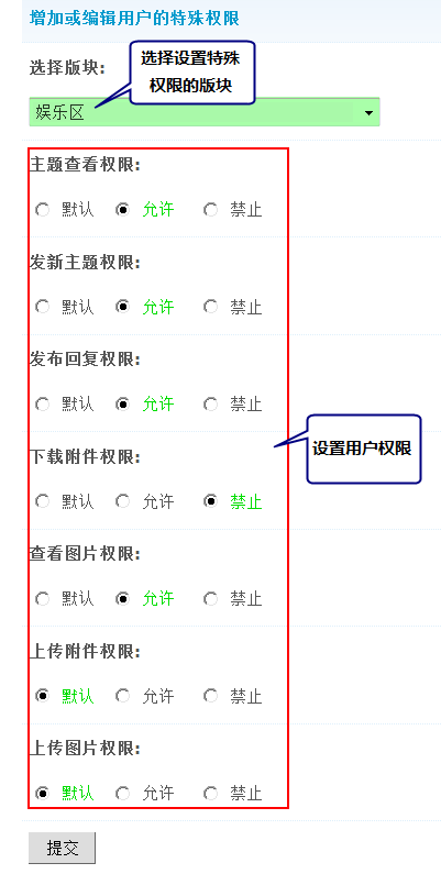 这里可以设置用户的特殊权限,作用类似扩展权限设置,扩展会员在论坛版块的浏览,发表和回复主题,下载/查看附件,上传附件/图片等权限。和设置扩展用户组不同的是:这里针对当前用户,而不是整个用户组。