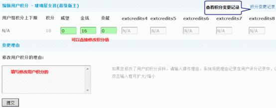 这里可以直接修改用户的积分数,点击“提交”即可生效。