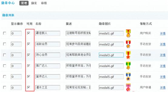 必须是可用的勋章才可以给用户颁发,操作路径:【后台】=>【运营】=>【勋章中心】设置可用的勋章和领取方式。