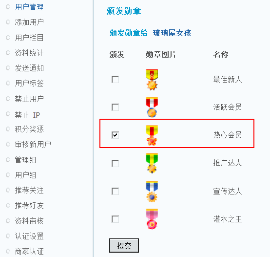 勾选想要颁发给该用户的勋章,然后点击“提交”即可。