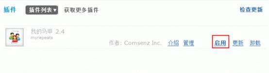 马甲功能必须要安装站点自带的马甲插件才可以使用,在后台安装完“我的马甲”插件以后,点击启用,如下图所示: