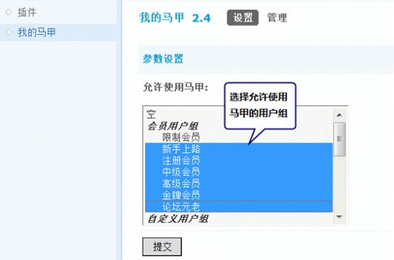设置可使用该功能的用户组,即可在前台设置“马甲”操作。