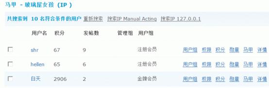 设置好后,点击“提交”按钮后,就会列出符合条件的会员列表并列出了马甲帐号的信息,可以按照会员管理中介绍的方法进行管理操作。