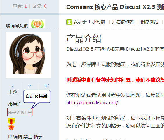 16)允许自定义头衔:设置是否允许用户设置自己的头衔名字并在帖子页面中显示。选择“是”用户在【个人资料】中设置自己的头衔后效果如下: