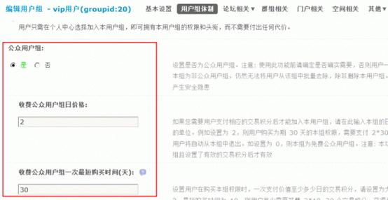 选择“是”会出现“收费公众用户组日价格”和“收费公众用户组一次最短购买时间”的设置