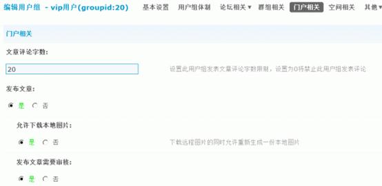 2)发布文章:设置是否允许此用户组用户在门户发布文章。选择“是”可以选择允许下载本地图片和发布文章是否需要审核,如果允许下载本地图片,那么下载远程图片的同时允许重新生成一份本地图片。
