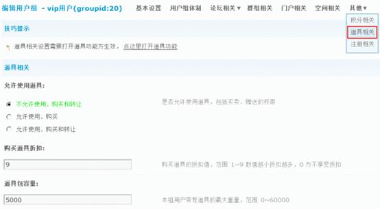 3)道具包容量:本组用户带有道具的最大重量,范围 0~60000。注:每个道具重量由道具设置决定。