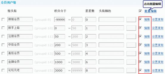 在这里,可以修改几个默认的系统用户组的名称与星星数目等,同样,点击“编辑”可以看到用户组的具体设置。