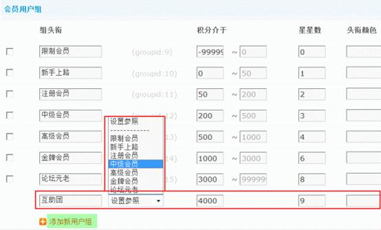 可以添加会员用户组,和自定义用户组,系统用户组是不可以添加的,添加用户后时可以设置组积分、星星数、头衔颜色以